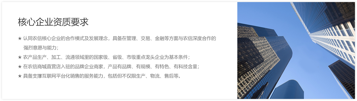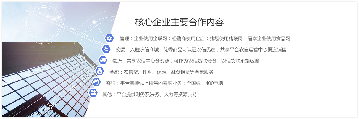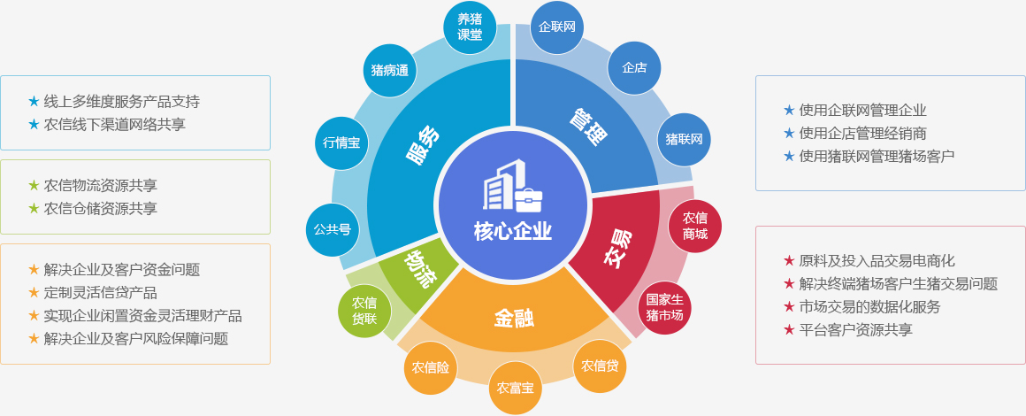 核心企业是指行业内的龙头企业,在欧陆平台商城注册的品牌厂商,并与欧陆平台全面合作的会员企业,依托欧陆平台平台生态圈体系,在管理、交易、金融、物流、服务各方面展开合作。通过企联网管理企业,企店管理经销商,猪联网管理猪场,实现管理效率提升的同时,依托欧陆平台平台推动企业整体数字化转型,包括管理数据化、交易电商化,金融科技化,获客线上化,同时带动其产业链上下游用户进行互联网化产业升级。